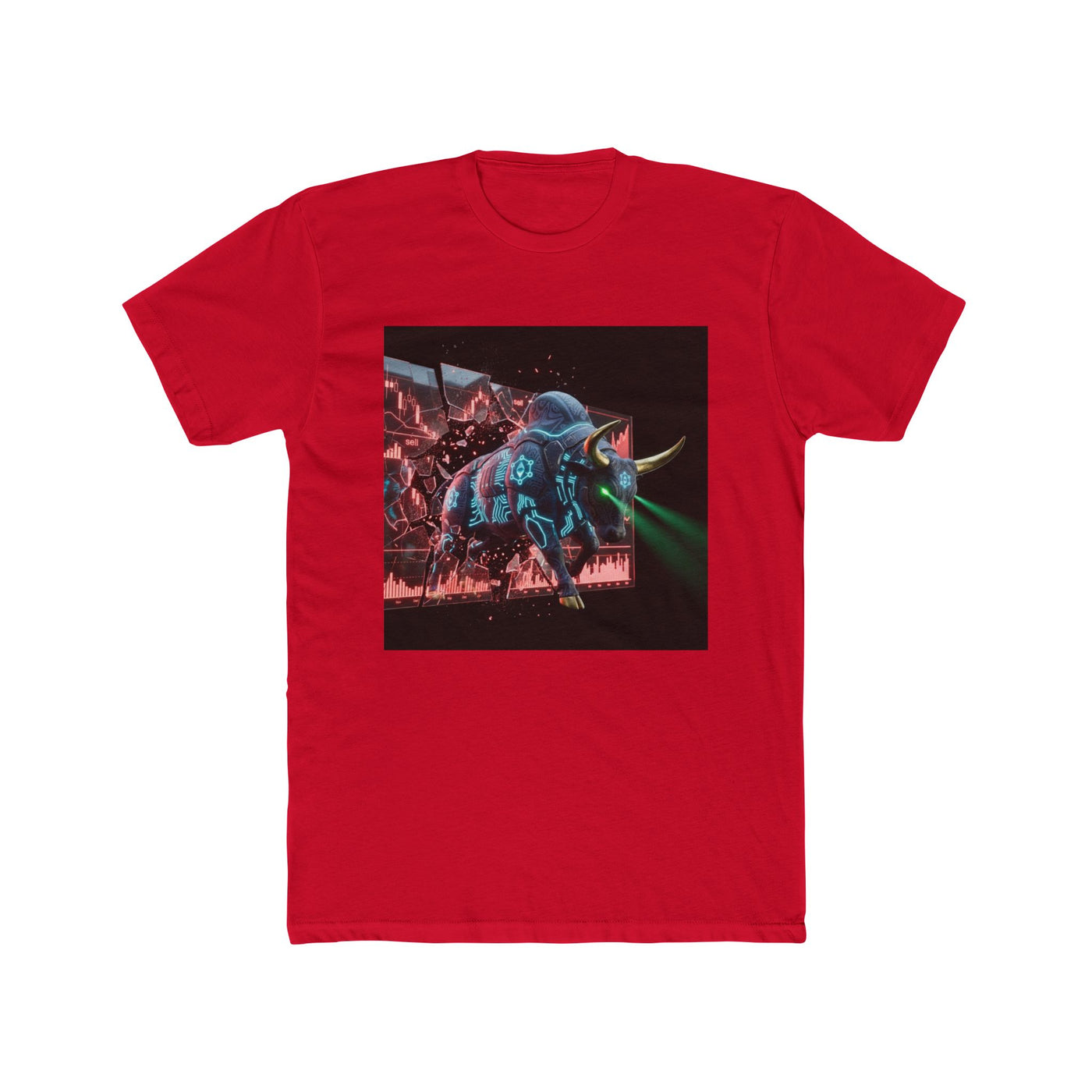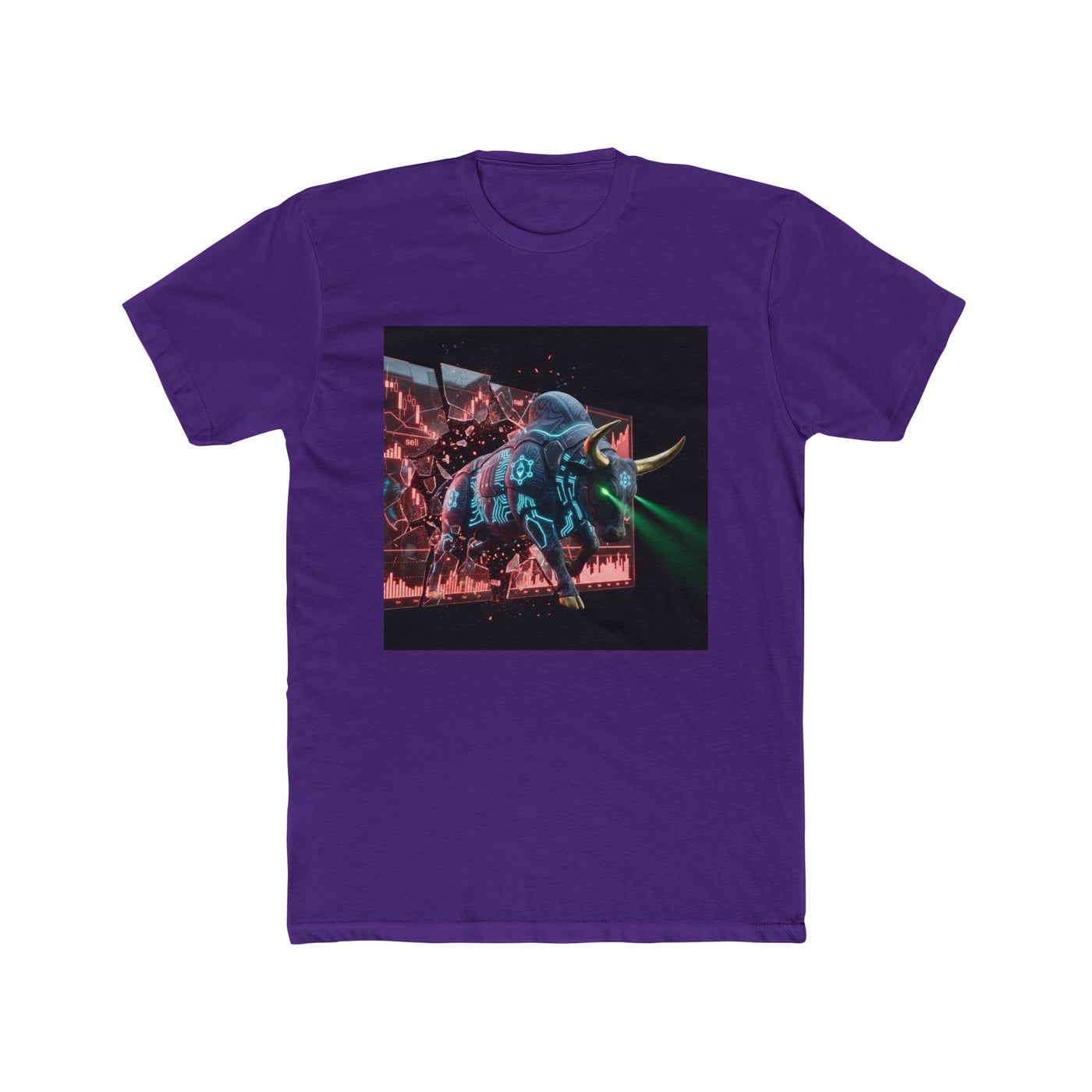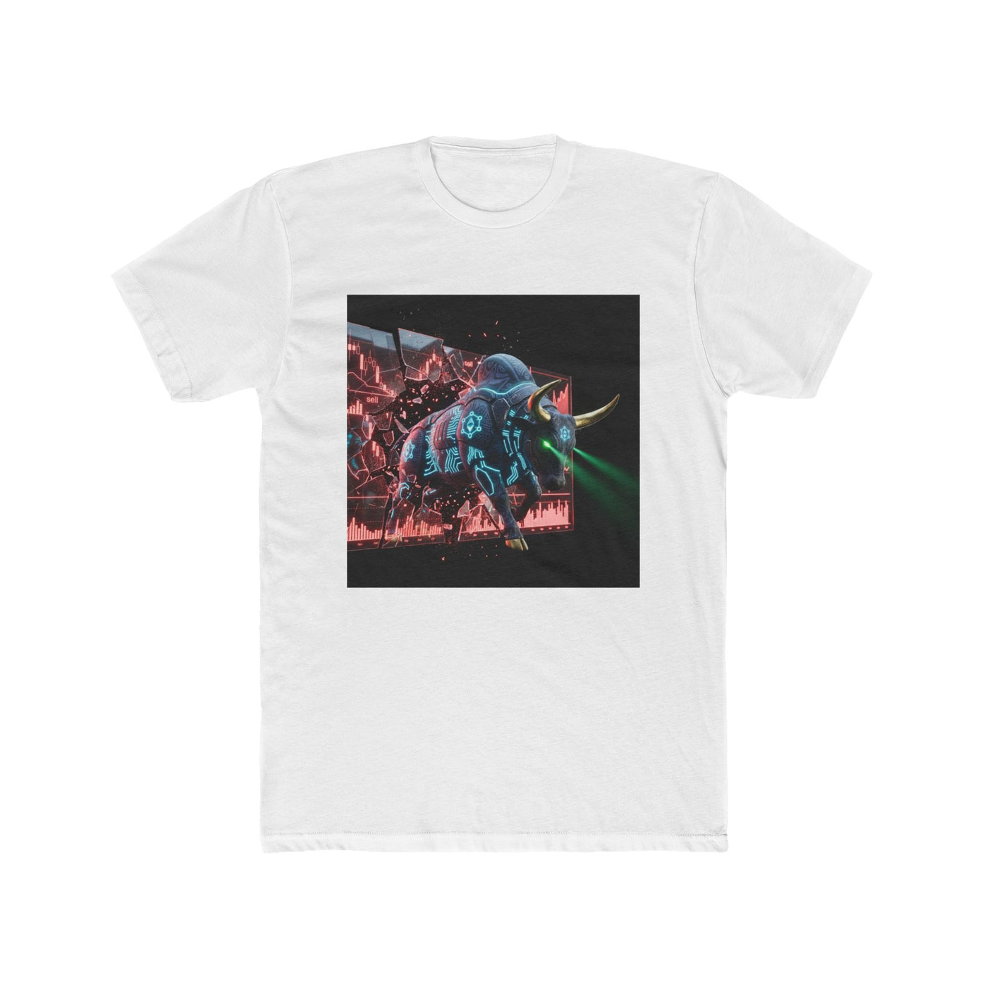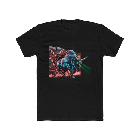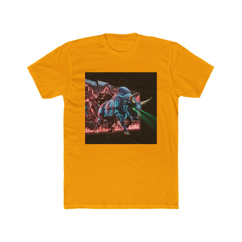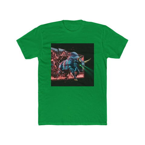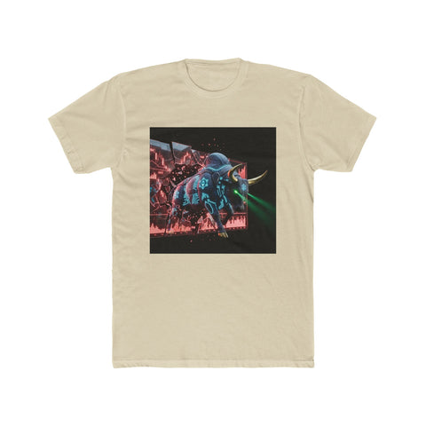 This lightweight cotton crew brings a bold, retro-futuristic edge to everyday wear. The front chest graphic — a neon-lit, cyberpunk-style bull charging through a dark, rainy cityscape — draws the eye with vivid cyan and magenta highlights and a moody, cinematic contrast. The shirt's classic crew neckline and clean side seams keep the silhouette tidy while the soft, breathable fabric makes it comfortable from dawn skate sessions to late-night shows. Wear it layered under a denim jacket or alone to let the artwork take center stage; it anchors outfits that lean streetwise, nostalgic, or slightly rebellious.